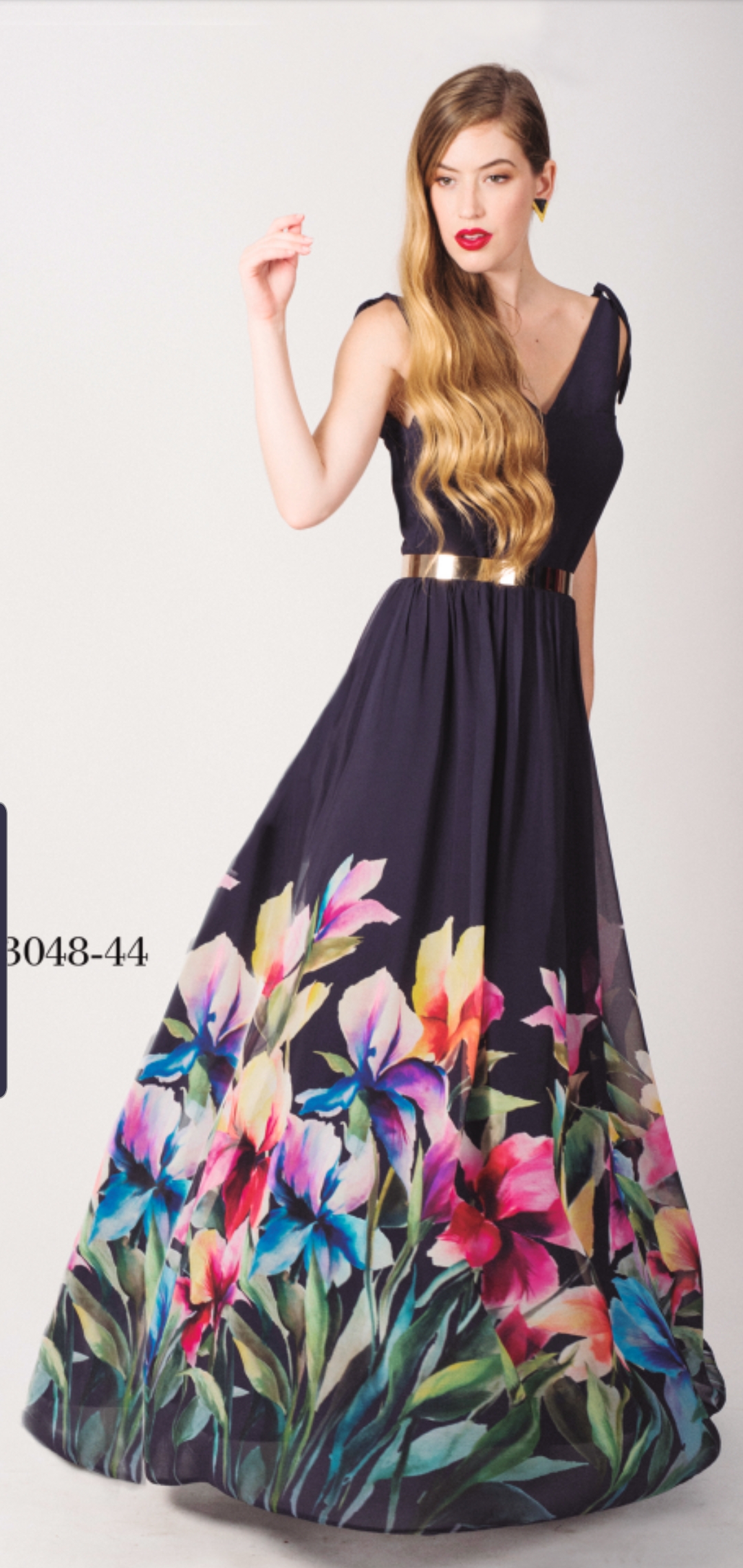 Vestido largo con falda de vuelo, escote a pico , tirantes anudados en los hombros
