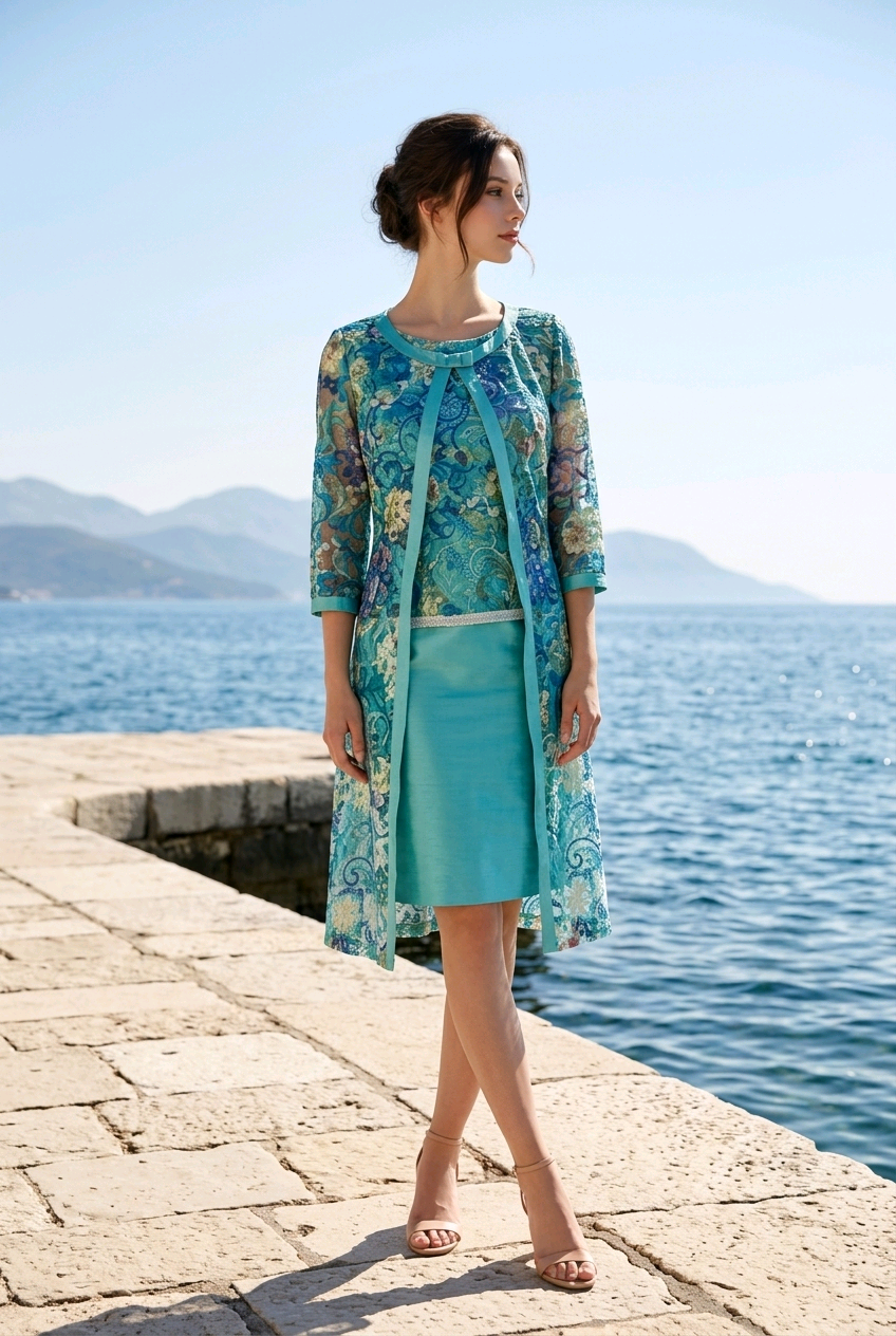 Conjunto de vestido y abrigo confeccionado en seda y guipur