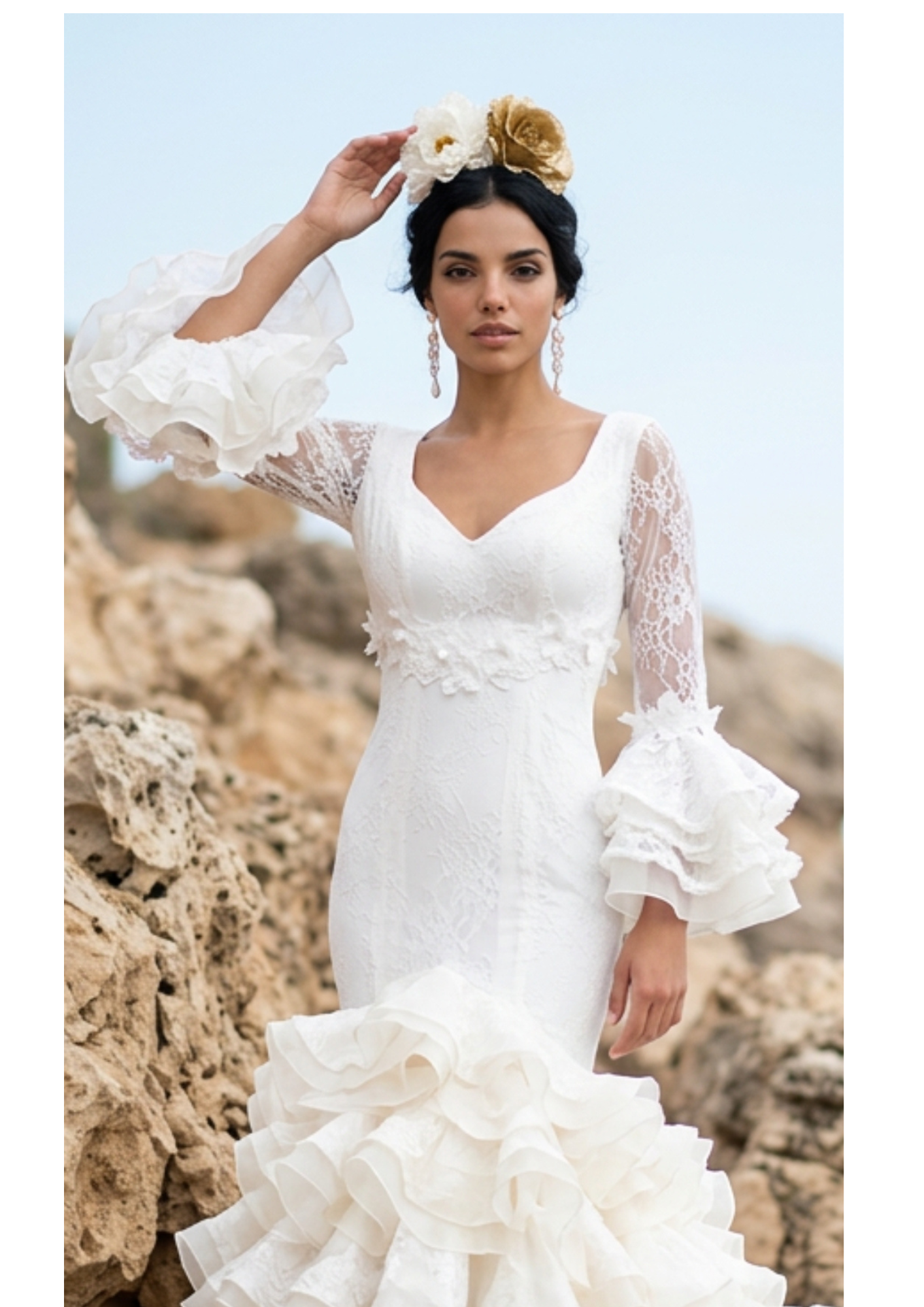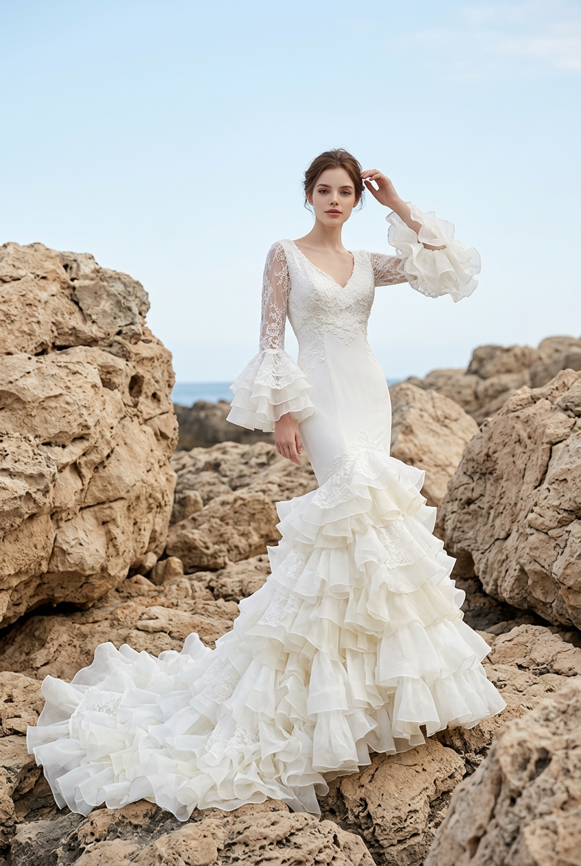 Vestido de novia de inspiración flamenca con cola. La cola de un tamaño de 1mt,
