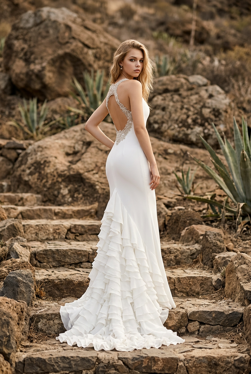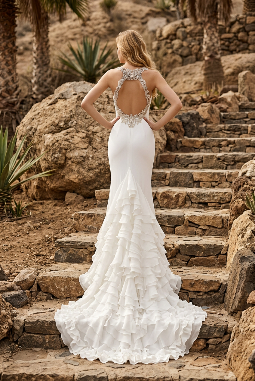 Vestido sirena realizado en crepe de inspiración flamenca con escote corazón.