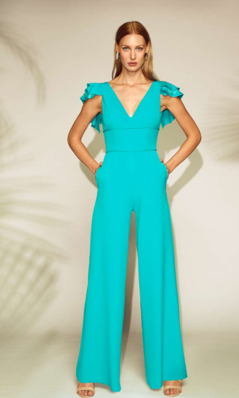 Mono de pata ancha con bolsillos , escote a pico y volantes en mangas