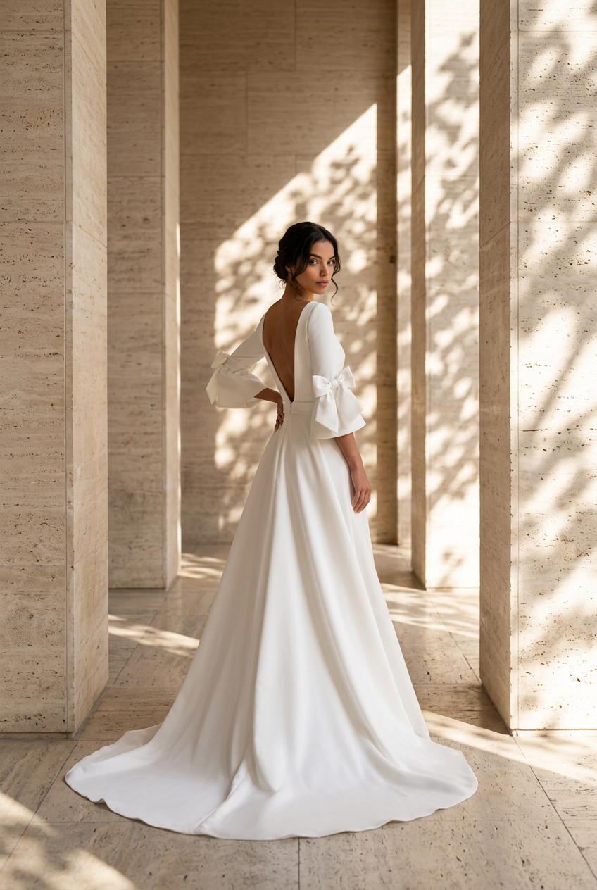 Vestido realizado en mikado de seda con falda sirena con originales cortes en la espalda. Desde la cintura sale una cola postiza del mismo tejido.