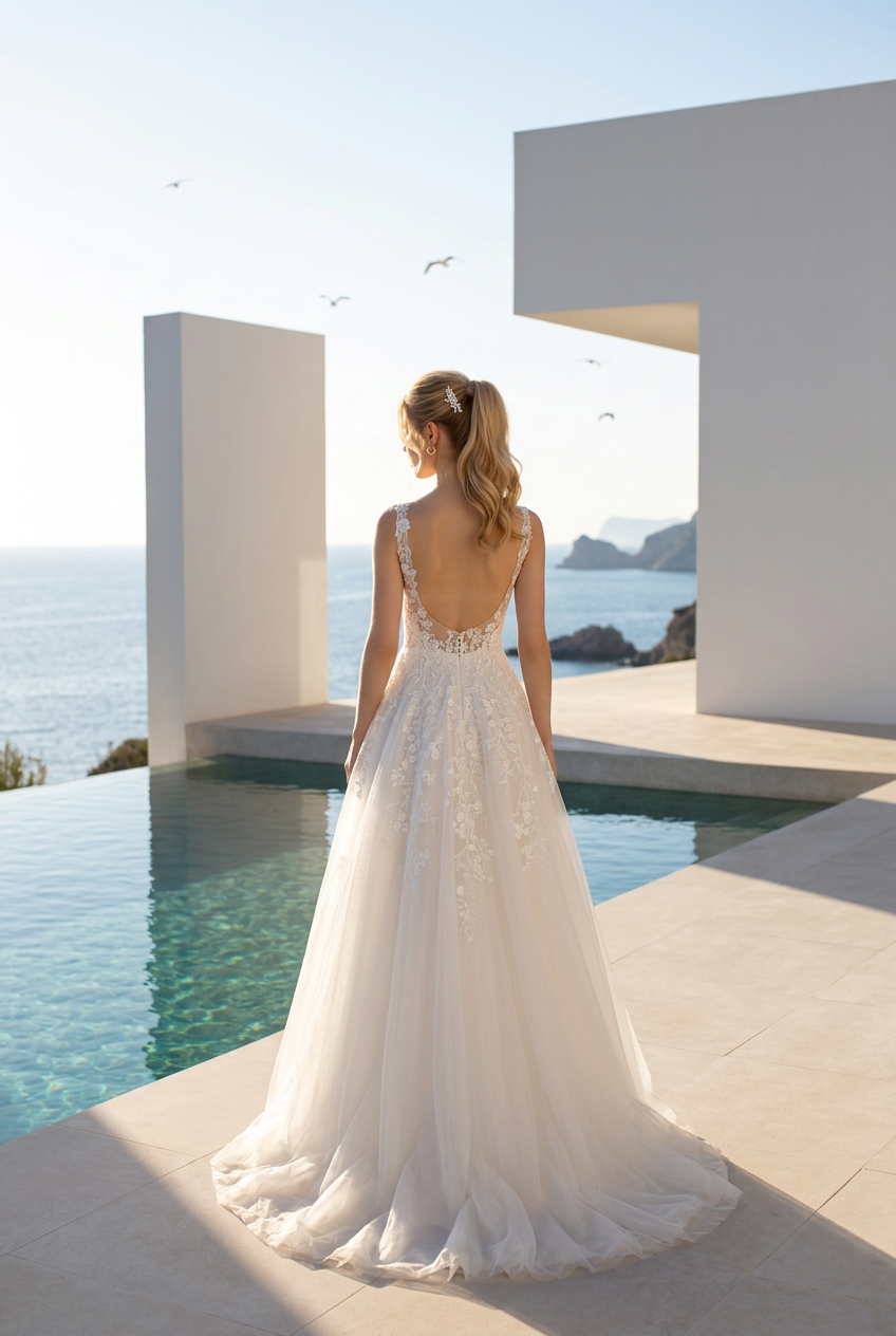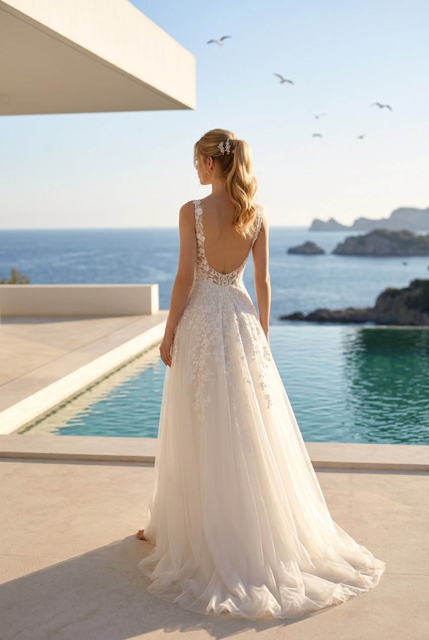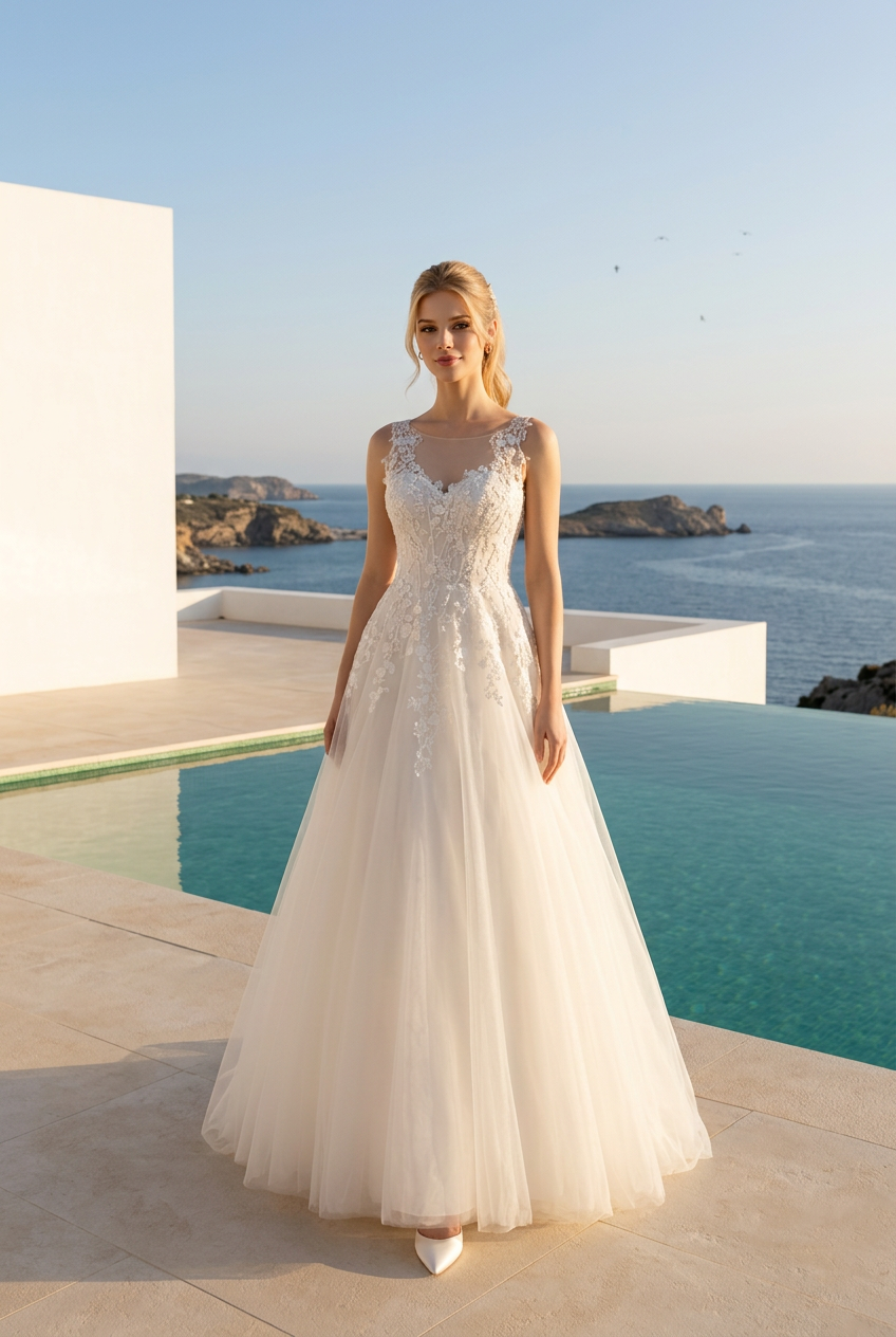 Bonito vestido de estilo princesa con cuerpo en encaje rebrodé