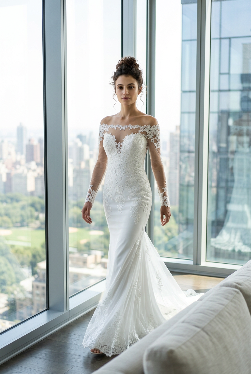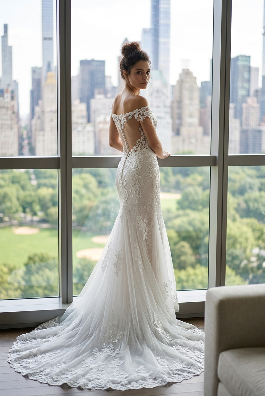Vestido de novia diseñado en encaje de corte sirena y generosa cola