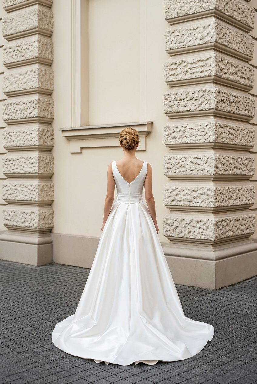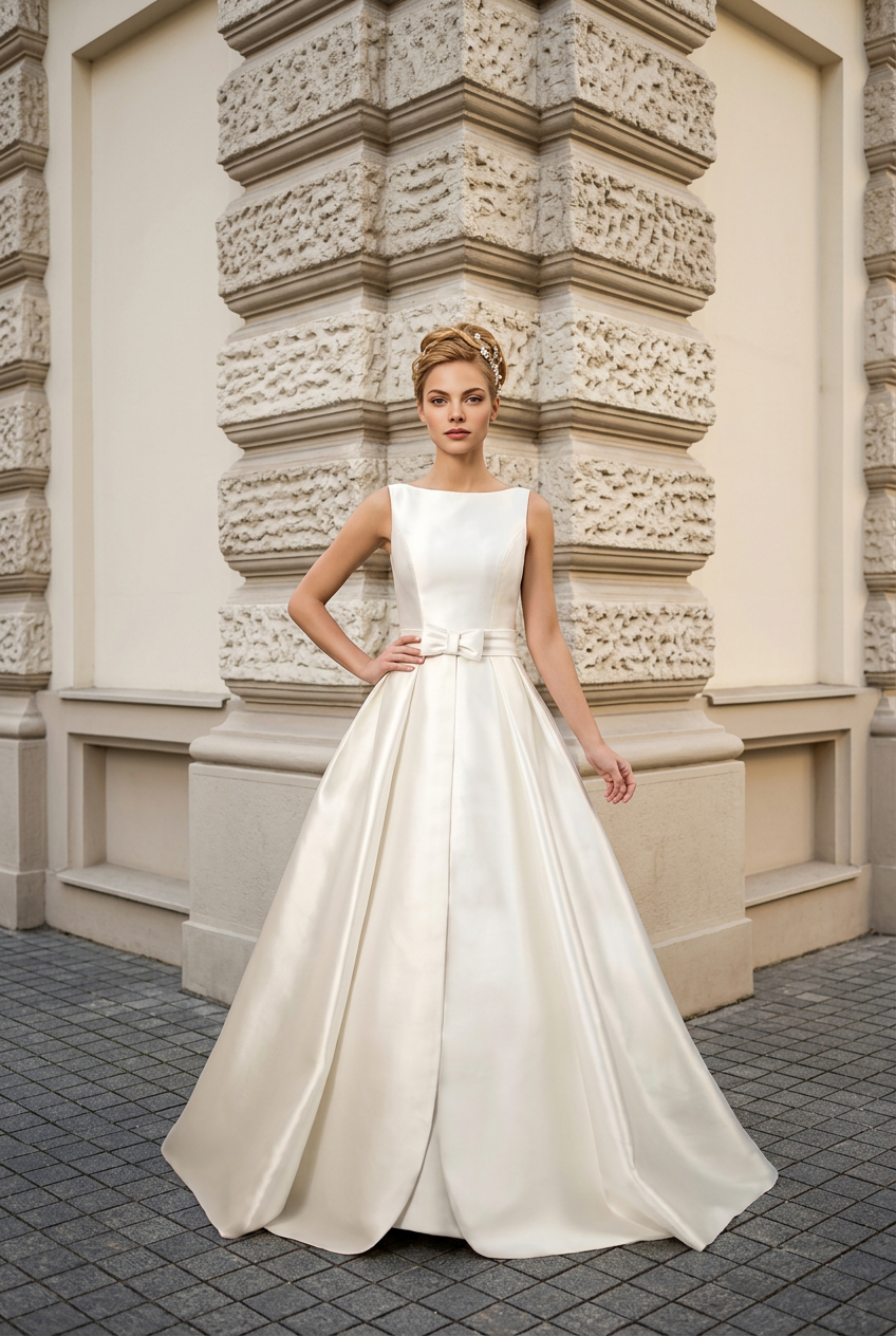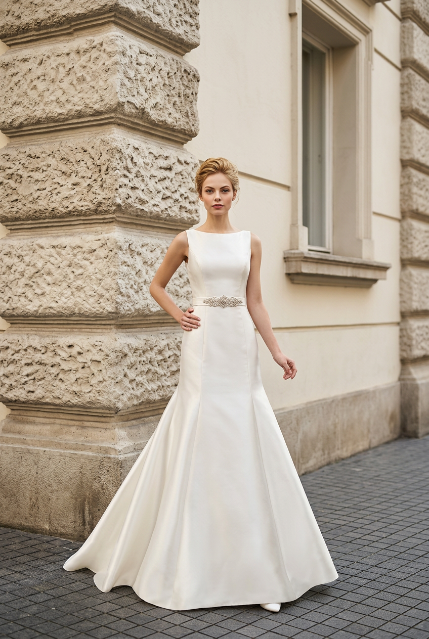 Vestido de novia realizado en mikado con escote barco