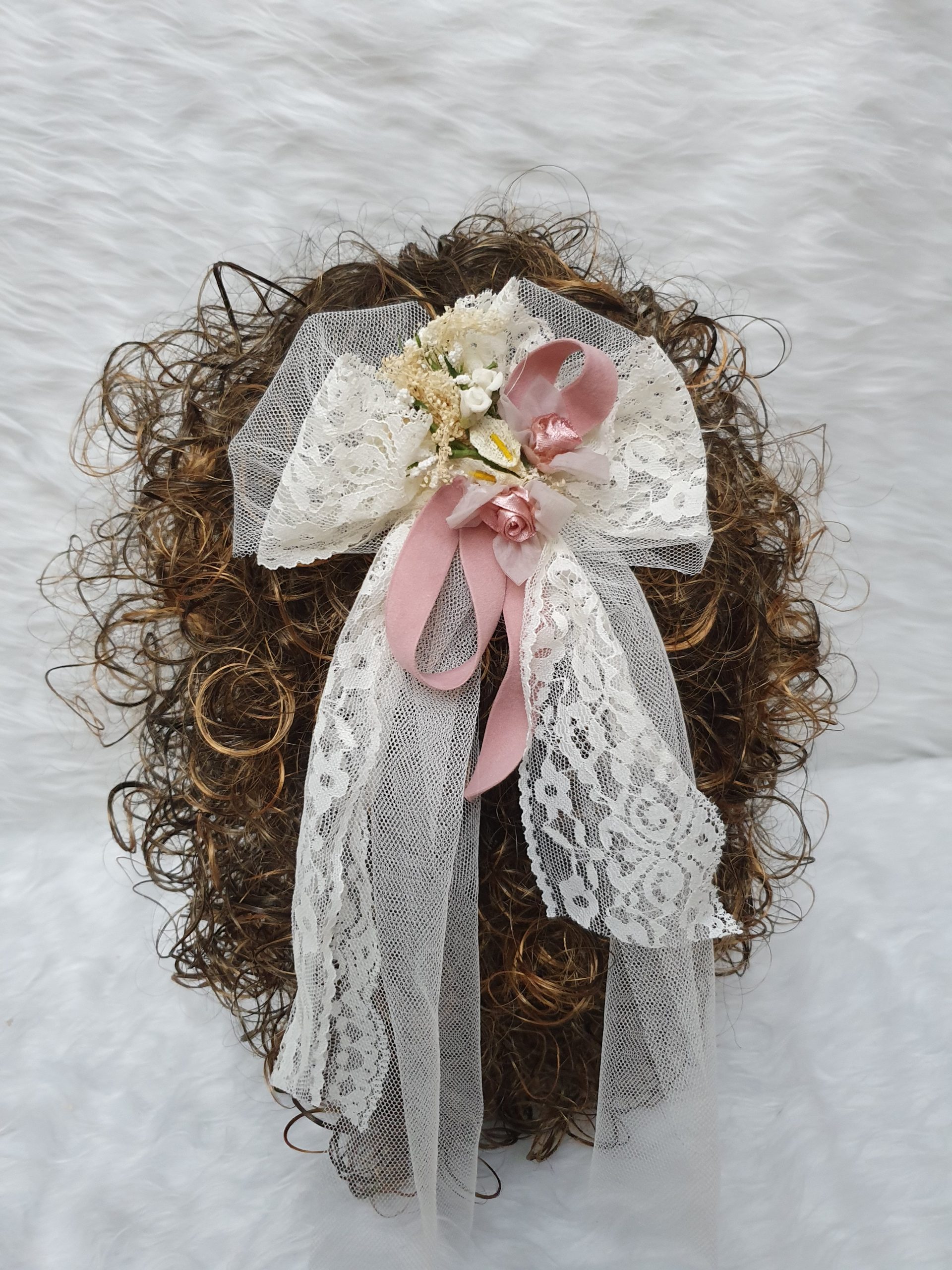 Tocado para comunión con flor de puntilla en tonos rosas y caídas en color marfil-rosa