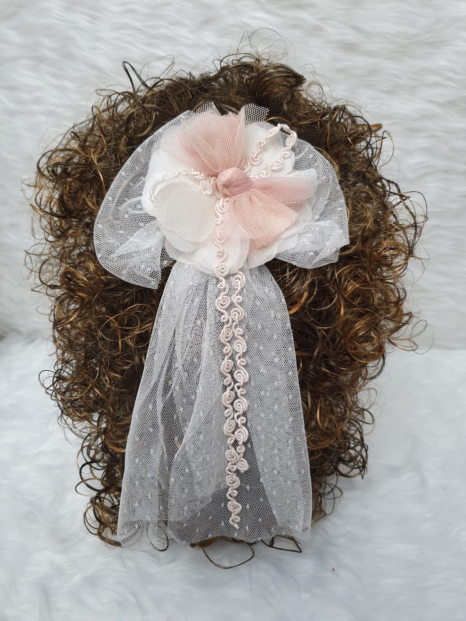 Tocado para comunión con flor de puntilla en tonos rosas y caídas en color marfil-rosa