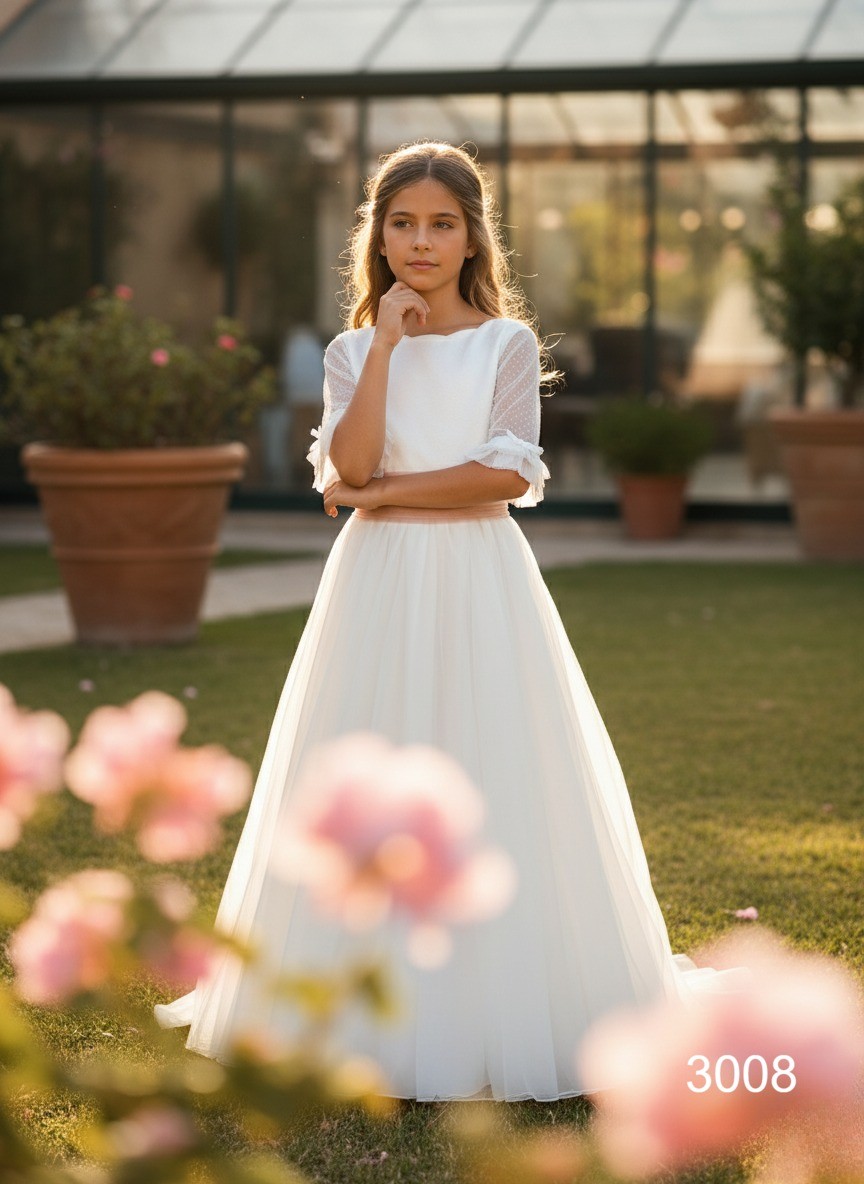 Vestido de comunión confeccionado en plumeti el cuerpo y falda en gasa con manga francesa.