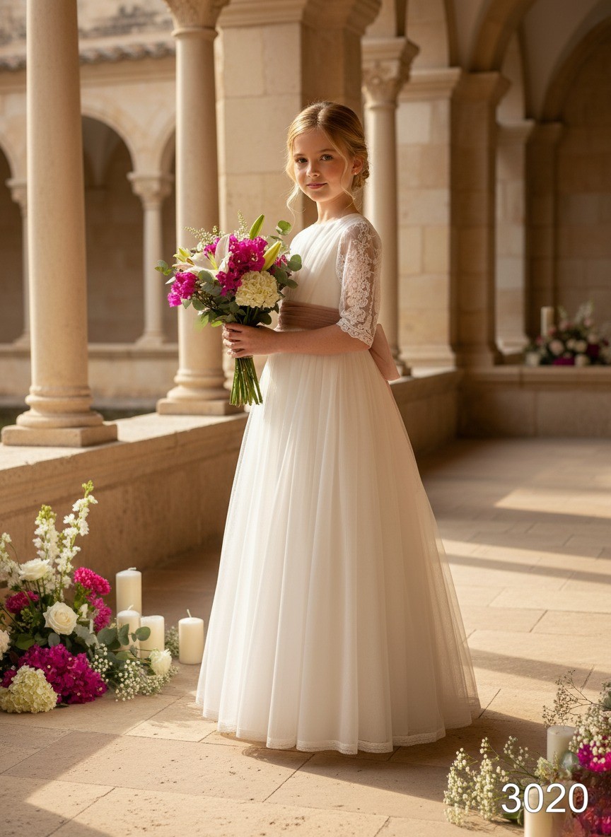 Vestido de comunión confeccionado en tul con encaje fino en el bajo y bonita manga francesa .
