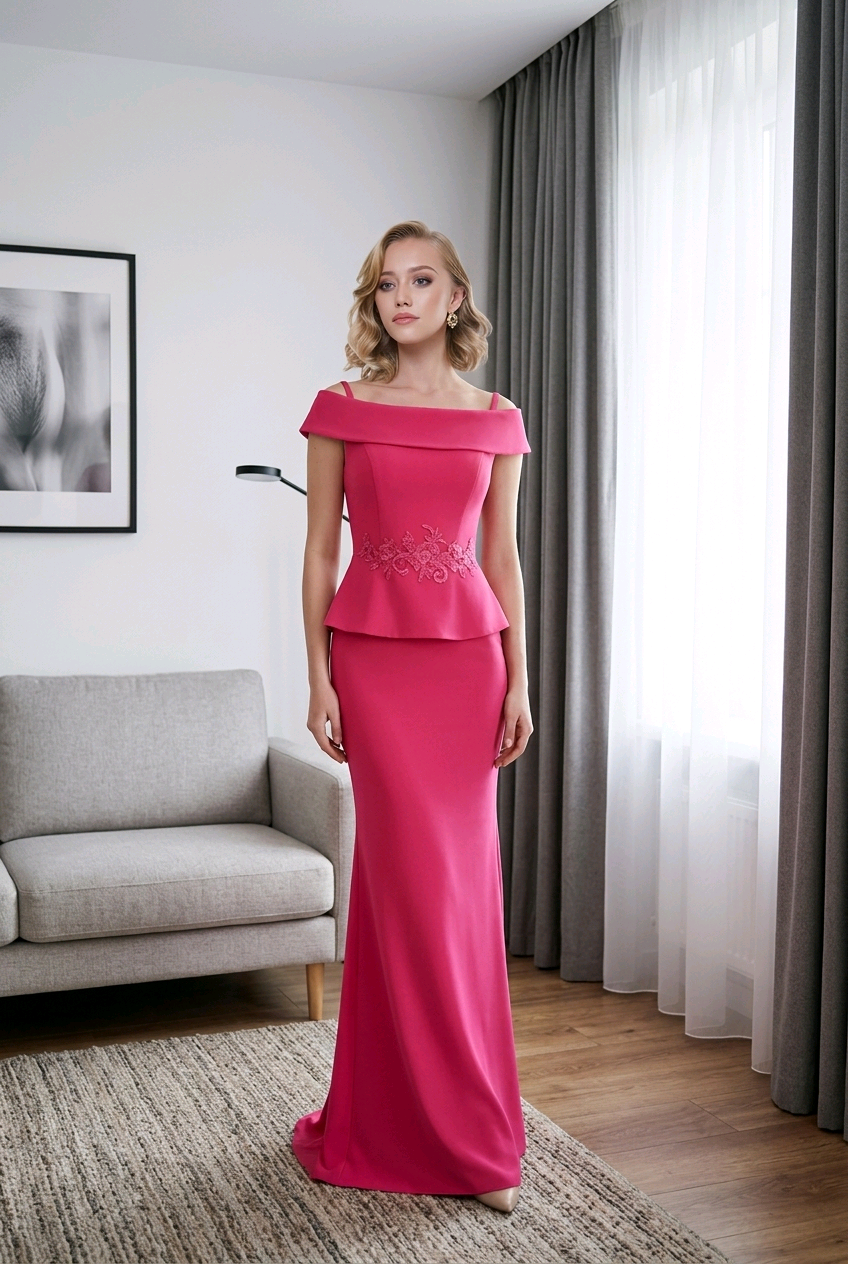 Vestido diseñado en crepe, largo de madriana con escote efecto hombros descubiertos.