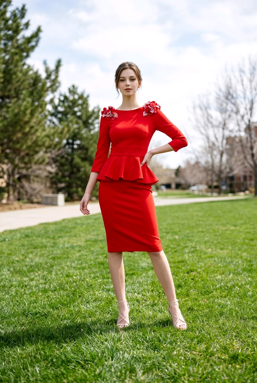 Vestido entallado con manga francesa y detalle de flores en los hombros
