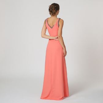 Vestido largo con pedrería en sisas y cuello, escote en la espalda a pico